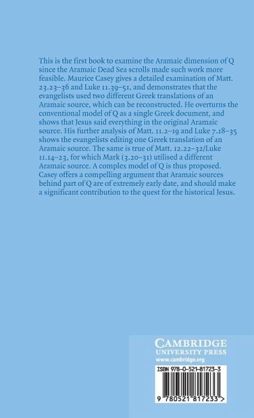 This is the first book to examine the Aramaic dimension of Q since the Aramaic Dead Sea scrolls made such work more feasible. Maurice Casey gives a detailed examination of key passages in Matthew and Luke's gospels, demonstrating that they used two different Greek translations of an Aramaic source, which can be reconstructed. He overturns the conventional model of Q as a single Greek document, and shows that Jesus said everything in the original Aramaic source. Further analysis of other gospel passages shows the evangelists editing a Greek translation of an Aramaic source. On one, it can be shown that Mark utilises a different Aramaic source. A complex model of Q is thus proposed. Casey argues that Aramaic sources behind part of Q are of extremely early date, and should contribute significantly to the quest for the historical Jesus.