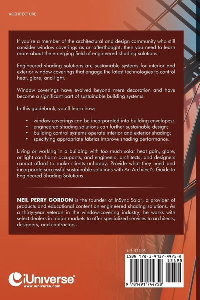 If you?re a member of the architectural and design community who still consider window coverings as an afterthought, then you need to learn more about the emerging field of engineered shading solutions. Engineered shading solutions are sustainable systems for interior and exterior window coverings that engage the latest technologies to control heat, glare, and light. Window coverings have evolved beyond mere decoration and have become a significant part of sustainable building systems. In this guidebook, you?ll learn how: ? window coverings can be incorporated into building envelopes; ? engineered shading solutions can further sustainable design; ? building control systems operate interior and exterior shading; ? specifying appropriate fabrics improve shading performance. Living or working in a building with too much solar heat gain, glare, or light can harm occupants, and engineers, architects, and designers cannot afford to make clients unhappy. Provide what they need and incorporate successful sustainable solutions with An Architect?s Guide to Engineered Shading Solutions.