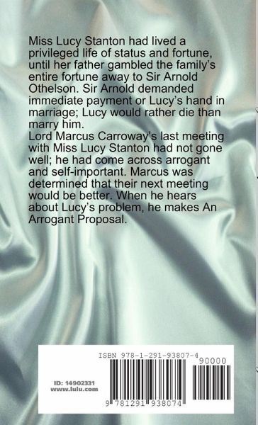 Miss Lucy Stanton had lived a privileged life of status and fortune, until her father gambled the family's entire fortune away to Sir Arnold Othelson. Sir Arnold demanded immediate payment or Lucy's hand in marriage; Lucy would rather die than marry him. Lord Marcus Carroway's last meeting with Miss Lucy Stanton had not gone well; he had come across arrogant and self-important. Marcus was determined that their next meeting would be better. When he hears about Lucy's problem, he makes An Arrogant Proposal.