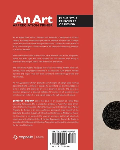 "An Art Appreciation Primer: Elements and Principles of Design helps students develop a thorough understanding of how the elements and principles of design can be applied to the understanding of composition. Students will then be able to apply this knowledge to unfamiliar works of art, beyond those typically presented in standard textbooks. Principles covered in this primer include visual elements such as line and pattern, shape and mass, light and color. Students will also enhance their ability to appreciate and interpret space, time and motion, and texture. The book helps students recognize and value how balance, rhythm, repetition, contrast, scale, and proportion are used in the visual arts. Each chapter includes activities and project ideas that allow students to immediately apply what they have learned. An Art Appreciation Primer: Elements and Principles of Design takes learning beyond textbooks and makes it possible for students to use their knowledge and skills to analyze and appreciate art in non-classroom contexts. The book is an excellent companion to standard textbooks for courses in art appreciation and introductory art history. It is also a great resource for high school art teachers. Jennifer Snyder earned her Ed.D. in art education at Florida State University, Tallahassee. She is an assistant professor at Austin Peay State University in Clarksville, Tennessee, where she also works with the London Study Abroad Program. Dr. Snyder is an active conference participant, most recently at the Society for Education through Art International Conference in Melbourne, Australia. In addition to her work with the university she serves as the high school arts coordinator for the Clarksville Arts & Heritage Development Council. Dr. Snyder is a member of the National Art Education Association and the public arts committee for the city of Clarksville."
