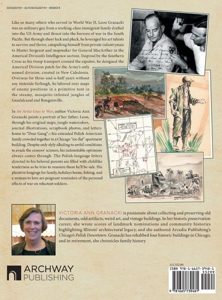 Like so many others who served in World War II, Leon Granacki was an ordinary guy from a working-class immigrant family drafted into the US Army and thrust into the horrors of war in the South Pacific. But through sheer luck and pluck, he leveraged his art talents to survive and thrive, catapulting himself from private infantryman to Master Sergeant and mapmaker for General MacArthur in the Americal Division's Intelligence section. Inspired by the Southern Cross as his troop transport crossed the equator, he designed the Americal Division patch for the Army's only named division, created in New Caledonia. Overseas for three-and-a-half years without any stateside furlough, he labored over maps of enemy positions in a primitive tent in the steamy, mosquito-infested jungles of Guadalcanal and Bougainville. In An Artist Goes to War, author Victoria Ann Granacki paints a portrait of her father, Leon, through his original maps, jungle watercolors, journal illustrations, scrapbook photos, and letters home to "Dear Gang"-his extended Polish American family crowded together in a Chicago "six-flat" apartment building. Despite only slyly alluding to awful conditions to evade the censors' scissors, his indomitable optimism always comes through. The Polish-language letters directed to his beloved parents are filled with childlike tenderness as he tries to reassure them he'll be safe. His plaintive longings for family, holidays home, fishing, and a woman to love are poignant reminders of the personal effects of war on reluctant soldiers.
