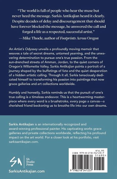 From award-winning, nationally acclaimed painter Sarkis Antikajian, an inspiring memoir about how our secret dreams shape us and the tenacity it takes to become who we were always meant to be. In the enchanting pages of An Artist's Odyssey, Sarkis Antikajian unveils a profoundly moving narrative that transcends time, weaving a tale of secret dreams, untamed yearning, and the unwavering courage to pursue one's true passion. From the sun-drenched streets of Amman, Jordan, to the quiet corners of Oregon, this memoir paints a portrait of Sarkis's journey-a journey shaped by familial expectations, the pursuit of a pharmacy degree in the United States, and the quiet desperation of a hidden artistic calling. From the moment Sarkis discovered a book on Impressionists at a local library during his boyhood, the dream of wielding a paintbrush became a beacon of hope. Faced with the responsibility of providing for his family, he concealed his artistic aspirations while navigating a career in pharmacy. However, the restless artist within him persisted, and as life unfolded-with degrees earned, emigration, marriage, and pharmacy jobs-Sarkis remained steadfast in his secret pursuit. The turning point came when he intentionally sought a community that cherished art and made Oregon his home. In the embrace of this supportive environment, Sarkis embarked on a slow but determined journey toward artistic proficiency and eventual mastery. Through setbacks, debts, and an array of imaginative business ventures, he tenaciously dedicated himself to transforming passion into paintings that now grace galleries and art collections worldwide. Humble and honest, Sarkis's evocative and compelling memoir reminds us that the pursuit of one's true calling is a timeless endeavor. An Artist's Odyssey is more than a memoir; it is a heartwarming masterpiece where every word is a brushstroke, every page a canvas-a cherished friend beckoning us to revisit, breathe life into our dreams, and celebrate the timeless truth that it's never too late to become who we were meant to be.