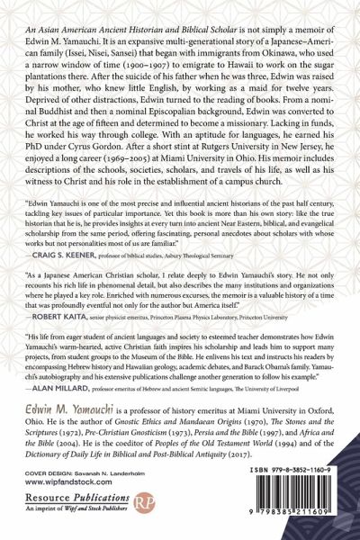 An Asian American Ancient Historian and Biblical Scholar is not simply a memoir of Edwin M. Yamauchi. It is an expansive multi-generational story of a Japanese-American family (Issei, Nisei, Sansei) that began with immigrants from Okinawa, who used a narrow window of time (1900-1915) to emigrate to Hawaii to work on the sugar plantations there. After the suicide of his father when he was three, Edwin was raised by his mother, who knew little English, by working as a maid for twelve years. Deprived of other distractions, Edwin turned to the reading of books. From a nominal Buddhist and then a nominal Episcopalian background, Edwin was converted to Christ at the age of fifteen and determined to become a missionary. Lacking in funds, he worked his way through college. With an aptitude for languages, he earned his PhD under Cyrus Gordon. After a short stint at Rutgers University in New Jersey, he enjoyed a long career (1969-2005) at Miami University in Ohio. His memoir includes descriptions of the schools, societies, scholars, and travels of his life, as well as his witness to Christ and his role in the establishment of a campus church.