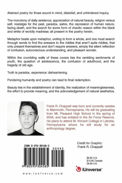 Abstract poetry for those sound in mind, disbelief, and unhindered inquiry. The monotony of daily existence, appreciation of natural beauty, religion versus self, nostalgia for the past, paradox, satire, the repression of human nature, facing death, and the search for some form of chaotic reason within the black and white of worldly madness: all present in the poetry herein. Metaphor beats upon metaphor, uniting to form a whole, and one must search through words to find the answers to the riddles that aren't quite riddles, that only present themselves and don't require answers, simply the silent reflection of confusion, subconscious understanding, and pleasant wonder. Within the crumbling walls of these covers lies the rambling sentiments of youth, the question of adolescence, the confusion of adulthood, and the tragedy of old age. Truth is paradox, experience: disheartening. Pondering humanity and poetry can lead to final redemption. Beauty lies in the establishment of identity, the realization of meaninglessness, the effort to provide meaning, and the acknowledgement of natural aesthetics.