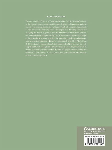 The tithe surveys of the early Victorian Age, after the great Domesday Book of the eleventh century, represent the most detailed and important national inventory to be taken before our own times. This 1986 book reconstructs elements of mid-nineteenth-century rural landscapes and farming systems by analysing the wealth of quantitative data which these tithe surveys contain, communicated cartographically by a set of 582 computer-generated maps, and statistically by a series of tables. The book also reveals the richness and variety of written evidence which the 14,829 parish tithe files (P.R.O. Class IR 18) contain, by means of analytical place and subject indexes for each English and Welsh county (some 200,000 entries in all) and by essays in which themes commonly encountered in the tithe file papers of each county are described. These sections of the book will be an essential tool for historians and historical geographers.