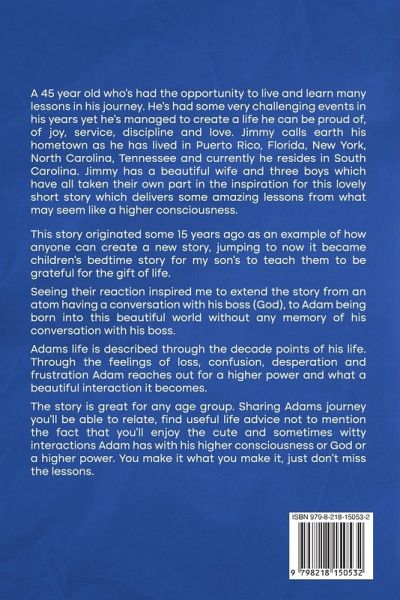 This story originated some 15 years ago as an example of how a group could create a story about the beginning of human kind. Almost two decades later it became a bedtime story for my son's in order to teach them to be grateful for the gift of life and to make sure they appreciate every single gift they possess. Seeing their reaction inspired me to extend the story from an atom having a conversation with his boss (or God), to Adam being born into this beautiful world without any memory of the conversation with his boss. Adams' life is described through the decade points of his life. Through the feelings of loss, confusion, desperation and frustration Adam reaches out for a higher power and what a beautiful interaction it becomes. The story is great for any age group. Sharing Adam's journey you'll be able to relate, find useful life advice not to mention the fact that you'll enjoy the cute and sometimes witty interactions Adam has with his higher consciousness or God or a higher power. You make it what you make it, just don't miss the lessons. A must read is an understatement. The lessons from a fictional book are amazing. A book to share with others.