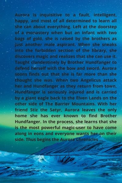 Aurora is inquisitive, stubborn, and has far too much courage for one so young. She is also a half-Elf orphan, left at the Monastery of St. Verruchts by the Satyr Stiz with two bags of gold and nothing else. She grows up thinking that she is just one of the other young aspirants, with her cropped hair and baggy robes. When she starts to develop into a beautiful young half-Elf female, things start going wrong. Banned from the library for reading the forbidden magic books, she is taken under the wing of the youngest of the Brothers who begins to teach her the bow and the sword. She soon learns that not only is she a girl but she can cast magic and with the help of the Satyr Stiz, she begins to learn that she isn't an ordinary half-Elf at all. Thus begins the adventures of Aurora Leafblade and her bumpy journey into womanhood as well as the dangerous world of Black and White Magic and of half-beasts and danger the likes of which she never had to deal with in the safety of the monastery.