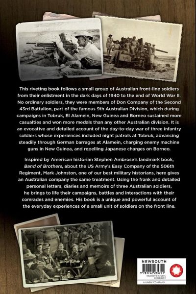 This riveting book follows a small group of Australian front-line soldiers from their enlistment in the dark days of 1940 to the end of World War II. No ordinary soldiers, they were members of Don Company of the Second 43rd Battalion, part of the famous 9th Australian Division, which — during campaigns in Tobruk, El Alamein, New Guinea, and Borneo — sustained more casualties and won more medals than any other Australian division. It is an evocative and detailed account of the day-to-day war of three infantry soldiers whose experiences included night patrols at Tobruk, advancing steadily through German barrages at Alamein, charging enemy machine guns in New Guinea, and repelling Japanese charges on Borneo. Inspired by American historian Stephen Ambrose’s landmark book, Band of Brothers, about the US Army’s Easy Company of the 506th Regiment, Mark Johnston, one of our best military historians, here gives an Australian company the same treatment. Using the frank and detailed personal letters, diaries, and memoirs of three Australian soldiers, he brings to life their campaigns, battles, and interactions with their comrades and enemies. His book is a unique and powerful account of the everyday experiences of a small unit of Australian soldiers on the front line.