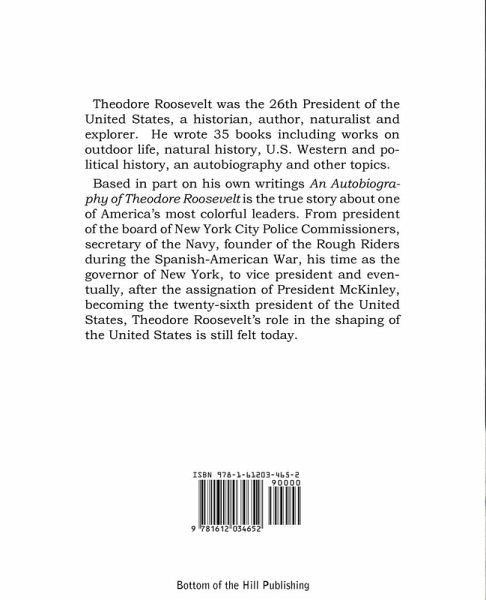 Theodore Roosevelt was the 26th President of the United States, a historian, author, naturalist and explorer. He wrote 35 books including works on outdoor life, natural history, U.S. Western and political history, an autobiography and other topics. Based in part on his own writings An Autobiography of Theodore Roosevelt is the true story about one of America's most colorful leaders. From president of the board of New York City Police Commissioners, secretary of the Navy, founder of the Rough Riders during the Spanish-American War, his time as the governor of New York, to vice president and eventually, after the assignation of President McKinley, becoming the twenty-sixth president of the United States, Theodore Roosevelt's role in the shaping of the United States is still felt today.