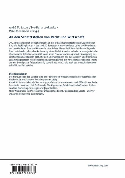 Die Herausgeber des Bandes sind am Fachbereich Wirtschaftsrecht der Westfälischen Hochschule am Standort Recklinghausen tätig. André M. Latour lehrt als Vertretungsprofessor Unternehmens- und Öffentliches Recht. Eva-Maria Lewkowicz ist Professorin für Allgemeine Betriebswirtschaftslehre, insbesondere Marketing, Strategie und Organisation. Mike Wienbracke ist Professor für Öffentliches Recht, insbesondere Staats- und Verwaltungsrecht sowie Europarecht.