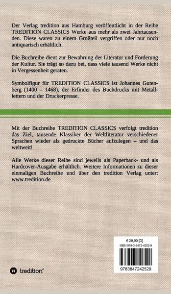 Diese Hardcover-Ausgabe ist Teil der TREDITION CLASSICS. Der Verlag tredition aus Hamburg veröffentlicht in der Buchreihe TREDITION CLASSICS Werke aus mehr als zwei Jahrtausenden. Diese waren zu einem Großteil vergriffen oder nur noch antiquarisch erhältlich. Mit TREDITION CLASSICS verfolgt tredition das Ziel, tausende Klassiker der Weltliteratur verschiedener Sprachen wieder als gedruckte Bücher zu verlegen und das weltweit! Die Buchreihe dient zur Bewahrung der Literatur und Förderung der Kultur. Sie trägt so dazu bei, dass viele tausend Werke nicht in Vergessenheit geraten.