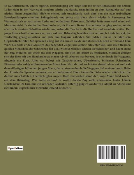 Es war Mitternacht, und es regnete. Trotzdem ging der junge Herr mit seiner Handtasche aus hellem Leder nicht in den Wartesaal, sondern schritt unablässig, ungeduldig an dem Bahngleise auf und nieder. Einen Augenblick blieb er stehen, sah unschlüssig nach dem von ein paar trübseligen Petroleumlampen erhellten Bahngebäude und setzte sich dann gleich wieder in Bewegung. Im Wartesaal roch es nach altem Leder und schlechtem Petroleum. Gelüftet hatte man wohl schon seit Monaten nicht. Er stellte die Handtasche ab, da ihn sein linker Arm schmerzte, ging weiter, kehrte aber nach wenigen Schritten wieder um, nahm die Tasche in die Rechte und wanderte weiter. Der junge Herr schritt strammer aus, denn auf dem Bahnsteig tauchten drei verlumpte Gestalten auf, die verdächtig genug aussahen und sich ihm langsam näherten. Sie redeten ihn an, er faßte sein Gepäckstück fester. Sie sprachen eifrig auf ihn ein, er nickte nur abweisend, denn er verstand kein Wort. Da hörte er das Geräusch des nahenden Zuges und atmete erleichtert auf. Aus allen Räumen quollen Menschen, der Schnellzug lief ein. »Minsk! Minsk!« schrien die Schaffner, und kaum stand der Zug, stürzten die Leute aus den Waggons, um sich am Büfett zu erfrischen. Mühsam drängte sich der Herr mit der Handtasche zu einem Abteil. Aber es war besetzt. Er eilte durch die Waggons, nirgends ein Platz. Alles war belegt mit Gepäckstücken, Überziehern, Schirmen, Schachteln, Eßwaren oder ruhig schlummernden Menschen. Nur ab und zu blickte einmal einer auf und sah dem eilfertigen, hübschen jungen Mann, der so stumm durch die Waggons lief, erstaunt nach. Hatte der Ärmste die Sprache verloren, war er taubstumm? Dann fielen die Lider wieder müde über die dunkel umschatteten, übernächtigten Augen. Halb verzweifelt stand der junge Mann bald wieder auf dem Bahnsteig. Was sollte er tun? Er wollte diesen Zug nicht versäumen. Unter keinen Umständen! Da kam ihm ein rettender Gedanke. Eilfertig ging er wieder von Abteil zu Abteil und rief hinein: »Spricht hier vielleicht jemand deutsch?«