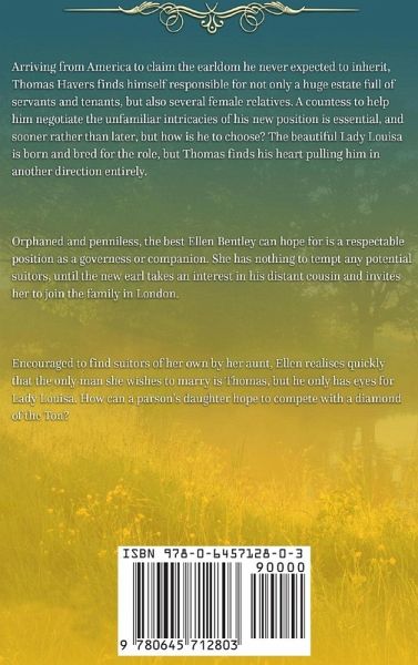 Arriving from America to claim the earldom he never expected to inherit, Thomas Havers finds himself responsible for not only a huge estate full of servants and tenants, but also several female relatives. A countess to help him negotiate the unfamiliar intricacies of his new position is essential, and sooner rather than later, but how is he to choose? The beautiful Lady Louisa is born and bred for the role, but Thomas finds his heart pulling him in another direction entirely. Orphaned and penniless, the best Ellen Bentley can hope for is a respectable position as a governess or companion. She has nothing to tempt any potential suitors, until the new earl takes an interest in his distant cousin and invites her to join the family in London. Encouraged to find suitors of her own by her aunt, Ellen realises quickly that the only man she wishes to marry is Thomas, but he only has eyes for Lady Louisa. How can a parson's daughter hope to compete with a diamond of the Ton? ¿An Earl For Ellen is a clean historical romance suitable for readers of all ages!