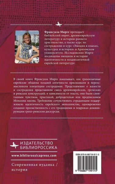 В своей книге Франсуаза Мирге показывает, как грекоязычные еврейские общины поздней античности присваивали и переосмысливали концепцию сострадания. Представления о жалости и сострадании представляли смесь еврейских, греческих и римских конструкций; в зависимости от текста, они были спонтанным чувством, практикой, добродетелью или предписанием иудаизма. Требование сочувствовать страдающим поддерживало идентичн&a