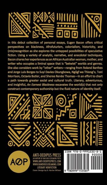 In this debut collection of personal essays, Eugen Bacon offers critical perspectives on blackness, Afrofuturism, colonialism, historicity, and (mis)recognition as she explores the untapped possibilities of speculative fiction. Using a variety of analytic, narrative, and anecdotal techniques, Bacon shares her experiences as an African Australian woman, mother, and writer who occupies a liminal space that is "betwixt" worlds and genres. She also considers work by "other" writers-ranging from Roland Barthes and Jorge Luis Borges to Suyi Davies Okungbowa, Ng¿g¿ wa Thiong'o, Toni Morrison, Octavia Butler, and Sheree Renée Thomas-in an effort to chart a path towards greater social and cultural truth. Literary, adventurous, and insightful, An Earnest Blackness excavates the world(s) that not only construct contemporary authorship but the fluid nature of identity itself.