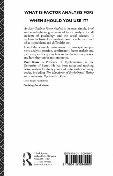 Factor analysis is a statistical technique widely used in psychology and the social sciences. With the advent of powerful computers, factor analysis and other multivariate methods are now available to many more people. An Easy Guide to Factor Analysis presents and explains factor analysis as clearly and simply as possible. The author, Paul Kline, carefully defines all statistical terms and demonstrates step-by-step how to work out a simple example of principal components analysis and rotation. He further explains other methods of factor analysis, including confirmatory and path analysis, and concludes with a discussion of the use of the technique with various examples. An Easy Guide to Factor Analysis is the clearest, most comprehensible introduction to factor analysis for students. All those who need to use statistics in psychology and the social sciences will find it invaluable. Paul Kline is Professor of Psychometrics at the University of Exeter. He has been using and teaching factor analysis for thirty years. His previous books include Intelligence: the psychometric view (Routledge 1990) and The Handbook of Psychological Testing (Routledge 1992).