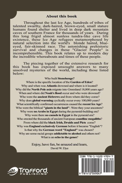 Throughout the last Ice Age, hundreds of tribes of talented swarthy, dark-haired, brown-eyed, small stature humans found shelter and lived in deep dark mountain caves of southern France for thousands of years. During this long frigid almost sunless tundra-like cave life existence, these Ice Age refugees metamorphosed by natural selection into the world's blonde haired, blue-eyed, fair-skinned race. The astonishing prehistoric survival and changes in these "Glacier People" is incomprehensible. This book relates up to modern day the incredible whereabouts and times of these people. The piercing together of the extensive research for this book has exposed unsought answers to many unsolved mysteries of the world, including those listed below: Who built Stonehenge? Where is the specific location of the Garden of Eden? Why and when was Atlantis drowned and where is it located? Why did the North Pole axis migrate into Greenland 18,000 years ago? When and where did Noah's flood occur and who were drowned? Who were the ancient Hebrews and from where did they come? Why does global warming cyclically occur every 100,000 years? What scientifically confirmed occurrences caused the recent Ice Age? Who were the biblical "giants in the land"-Were they your ancestors? Why were no Arabs in Egypt during the pyramid-building era? Why were there no camels in Egypt in the pyramid era? Who erected the thousands of ancient European coastline megaliths? From where did the black Irish, Druids and Piets come? Why was England exclusively German before it became "English"? Is that why the German word "England" was chosen? Why are some racial groups addictable to alcohol and others not? What is an echo in the genes? Enjoy, have fun, be amazed and learn.