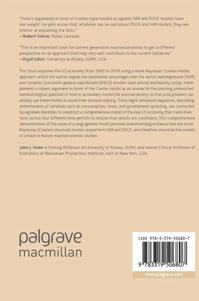 This book explores the US economy from 1960 to 2010 using a more Keynsian, Cowles model approach, which the author argues has substantial advantages over the vector autoregression (VAR) and dynamic stochastic general equilibrium (DSGE) models used almost exclusively today. Heim presents a robust argument in favor of the Cowles model as an answer to the pressing, unresolved methodological question of how to accurately model the macroeconomy so that policymakers can reliably use these models to assist their decision making. Thirty-eight behavioral equations, describing determinants of variables such as consumption, taxes, and government spending, are connected by eighteen identities to construct a comprehensive model of the real US economy that Heim then tests across four different time periods to ensure that results are consistent. This comprehensive demonstration of the value of a long-ignored model provides overwhelming evidence that the more Keynesian (Cowles) structural modelsoutperform VAR and DSGE, and therefore should be the models of choice in future macroeconomic studies.