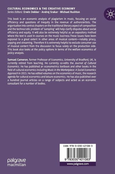 This book is an economic analysis of plagiarism in music, focusing on social efficiency and questions of inequity in the revenue of authors/artists. The organisation into central chapters on the traditional literary aspect of composition and the technocratic problem of 'sampling' will help clarify disputes about social efficiency and equity. It will also be extremely helpful as an expository method where the text is used in courses on the music business.