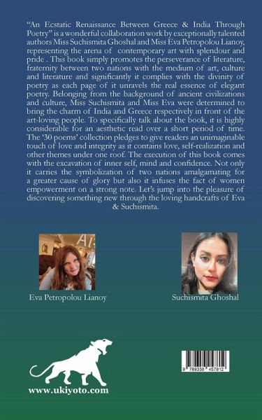 "An Ecstatic Renaissance Between Greece & India Through Poetry" is a wonderful collaboration work by exceptionally talented authors Miss Suchismita Ghoshal and Miss Eva Petropolou Lianoy, representing the arena of contemporary art with splendour and pride . This book simply promotes the perseverance of literature, fraternity between two nations with the medium of art, culture and literature and significantly it complies with the divinity of poetry as each page of it unravels the real essence of elegant poetry. Belonging from the background of ancient civilizations and culture, Miss Suchismita and Miss Eva were determined to bring the charm of India and Greece respectively in front of the art-loving people. To specifically talk about the book, it is highly considerable for an aesthetic read over a short period of time. The '30 poems' collection pledges to give readers an unimaginable touch of love and integrity as it contains love, self-realization and other themes under one roof. The execution of this book comes with the excavation of inner self, mind and confidence. Not only it carries the symbolization of two nations amalgamating for a greater cause of glory but also it infuses the fact of women empowerment on a strong note. Let's jump into the pleasure of discovering something new through the loving handcrafts of Eva & Suchismita.