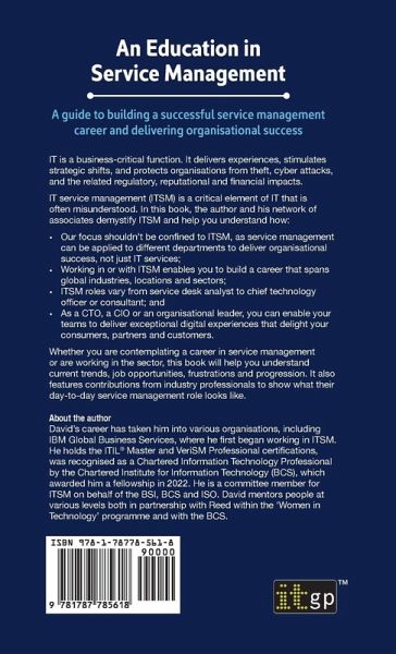 An Education in Service Management - A guide to building a successful service management career and delivering organisational success IT is a business-critical function. It delivers experiences, stimulates strategic shifts, and protects organisations from theft, cyber attacks, and the related regulatory, reputational and financial impacts. ITSM is a critical element of IT that is often misunderstood. In this book, the author and his network of associates demystify ITSM and help you understand how:Working in or with ITSM enables you to build a career that spans global industries, locations and sectors; ITSM roles vary from service desk analyst to chief technology officer or consultant; and As a CTO, a CIO or an organisational leader, you can enable your teams to deliver exceptional digital experiences that delight your consumers, partners and customers.