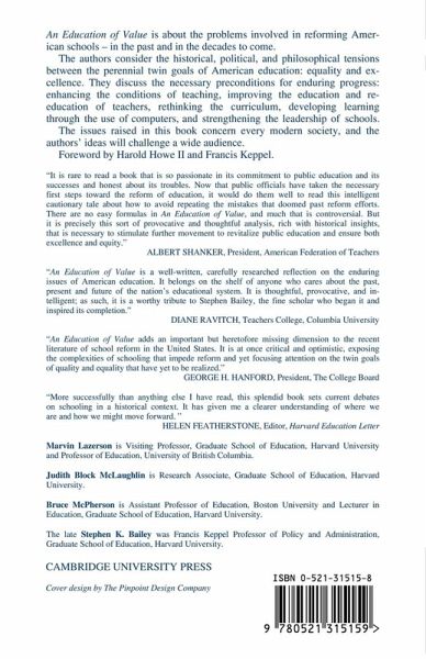 An Education of Value is about the problems involved in reforming American schools - in the past and in the decades to come. The authors consider the historical, political, and philosophical tensions between the perennial twin goals of American education: equality and excellence. They discuss the necessary preconditions for enduring progress: enhancing the conditions of teaching, improving the education and re-education of teachers, rethinking the curriculum, developing learning through the use of computers, and strengthening the leadership of schools. The issues raised in this book concern every modern society, and the authors' ideas will challenge a wide audience.