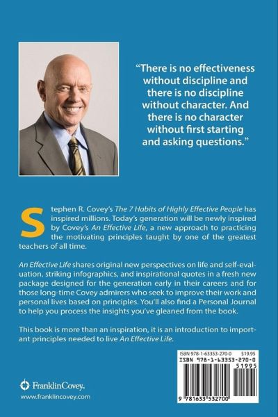 Covey wisdom ¿ A key to satisfaction and success Stephen R. Covey's The 7 Habits of Highly Effective People has inspired millions. Today's generation will be newly inspired by Covey's An Effective Life, a new approach to practicing the motivating principles taught by one of the greatest teachers of all time. An Effective Life shares original new perspectives on life and self-evaluation, striking infographics, and inspirational quotes in a fresh new package designed for the generation early in their careers and for those long-time Covey admirers who seek to improve their work and personal lives based on principles. You'll also find a Personal Journal to help you process the insights you've gleaned from the book. This book is more than an inspiration, it is an introduction to important principles needed to live An Effective Life.