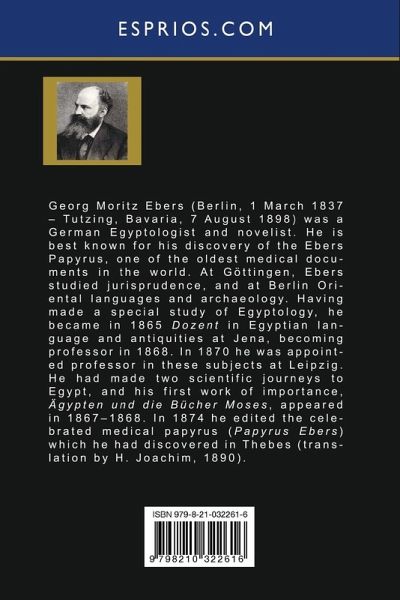 Georg Moritz Ebers (Berlin, 1 March 1837 - Tutzing, Bavaria, 7 August 1898) was a German Egyptologist and novelist. He is best known for his discovery of the Ebers Papyrus, one of the oldest medical documents in the world. At Göttingen, Ebers studied jurisprudence, and at Berlin Oriental languages and archaeology. Having made a special study of Egyptology, he became in 1865 Dozent in Egyptian language and antiquities at Jena, becoming professor in 1868. In 1870 he was appointed professor in these subjects at Leipzig. He had made two scientific journeys to Egypt, and his first work of…mehr