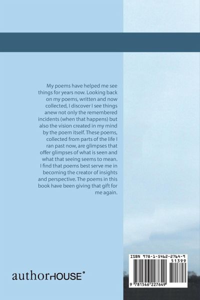 My poems have helped me see things for years now. Looking back on my poems, written and now collected, I discover I see things anew not only the remembered incidents (when that happens) but also the vision created in my mind by the poem itself. These poems, collected from parts of the life I ran past now, are glimpses that offer glimpses of what is seen and what that seeing seems to mean. I find that poems best serve me in becoming the creator of insights and perspective. The poems in this book have been giving that gift for me again.