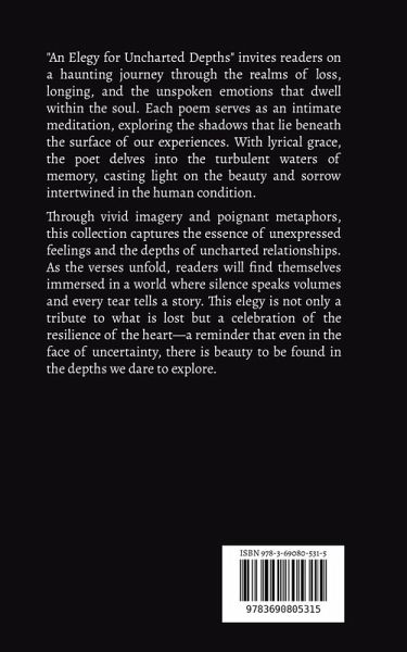 "An Elegy for Uncharted Depths" invites readers on a haunting journey through the realms of loss, longing, and the unspoken emotions that dwell within the soul. Each poem serves as an intimate meditation, exploring the shadows that lie beneath the surface of our experiences. With lyrical grace, the poet delves into the turbulent waters of memory, casting light on the beauty and sorrow intertwined in the human condition. Through vivid imagery and poignant metaphors, this collection captures the essence of unexpressed feelings and the depths of uncharted relationships. As the verses unfold, readers will find themselves immersed in a world where silence speaks volumes and every tear tells a story. This elegy is not only a tribute to what is lost but a celebration of the resilience of the heart-a reminder that even in the face of uncertainty, there is beauty to be found in the depths we dare to explore.