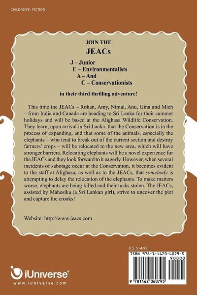 JOIN THE JEACs J - Junior E - Environmentalists A - And C - Conservationists in their third thrilling adventure! This time the JEACs - Rohan, Amy, Nimal, Anu, Gina and Mich- from India and Canada are heading to Sri Lanka for their summer holidays and will be based at the Alighasa Wildlife Conservation. They learn, upon arrival in Sri Lanka, that the Conservation is in the process of expanding, and that some of the animals, especially the elephants - who tend to break out of the current section and destroy farmers' crops - will be relocated to the new area, which will have stronger barriers. Relocating elephants will be a novel experience for the JEACs and they look forward to it eagerly. However, when several incidents of sabotage occur at the Conservation, it becomes evident to the staff at Alighasa, as well as to the JEACs, that somebody is attempting to delay the relocation of the elephants. To make matters worse, elephants are being killed and their tusks stolen. The JEACs, assisted by Mahesika (a Sri Lankan girl), strive to uncover the plot and capture the crooks! Website: http://www.jeacs.com