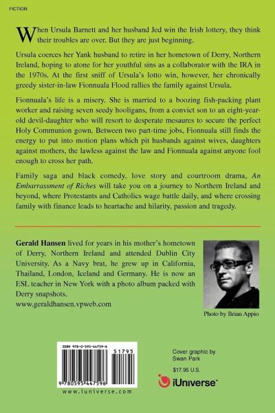 When Ursula Barnett and her husband Jed win the Irish lottery, they think their troubles are over. But they are just beginning. Ursula coerces her Yank husband to retire in her hometown of Derry, Northern Ireland, hoping to atone for her youthful sins as a collaborator with the IRA in the 1970s. At the first sniff of Ursula's lotto win, however, her chronically greedy sister-in-law Fionnuala Flood rallies the family against Ursula. Fionnuala's life is a misery. She is married to a boozing fish-packing plant worker and raising seven seedy hooligans, from a convict son to an eight-year-old devil-daughter who will resort to desperate mesaures to secure the perfect Holy Communion gown. Between two part-time jobs, Fionnuala still finds the energy to put into motion plans which pit husbands against wives, daughters against mothers, the lawless against the law and Fionnuala against anyone fool enough to cross her path. Family saga and black comedy, love story and courtroom drama, An Embarrassment of Riches will take you on a journey to Northern Ireland and beyond, where Protestants and Catholics wage battle daily, and where crossing family with finance leads to heartache and hilarity, passion and tragedy.