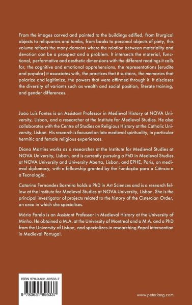 I - Liturgy and religious experience : Juliette J. Day : Eucharistic materiality and Lay Liturgical experience in the Early Middle Ages - Miri Rubin : Revisiting Corpus Christi: Where we are and how we got here - Ángel Pazos-López : Imagen y ritual en el Antifonario de León: iconografía y materialidad de la liturgia hispánica altomedieval - II - The devotional agency of images: Religion and power : Henning Laugerud : The devotional agency of images. Visions, the visual and memory in the late Middle Ages - Chiara Paniccia : Ecclesia e Synagoga. Il racconto politico del corpo femminile nel contesto del portale della cattedrale e del libro miniato - Audrey Ségard : Images religieuses gravées et sculptées sur les murs d'une prison de l'officialité de Cambrai à la fin du Moyen Âge. Les graffiti figuratifs du château de Selles de Cambrai (XIVe- XVIe siècles), des signes de dévotions aux intentions pénitentielles - Laura Méndez Vergel : Lujo y brillo en el Pórtico de la Gloria. Lectura medieval e interpretaciones visuales - III - Supporting religious life: Books, images and devotional objects : Silvia Maddalo : Bibbie di committenza sveva: uno scriptorium italo meridionale? - Ana Catarina Pinheiro / Margarida Faustino / Ana Tourais / Catarina Gonçalves / Conceição Casanova : The Medieval leather bookbinding of Santa Maria de Alcobaça: Technological approaches - Ana Tourais / Conceição Casanova : Material characterisation of the codices from the Monastery of Santa Maria de Alcobaça: Developing a new tool - Samuel Arrojado Rodrigues / Conceição Casanova : Study and conservation of a 12th century codex from the Monastery