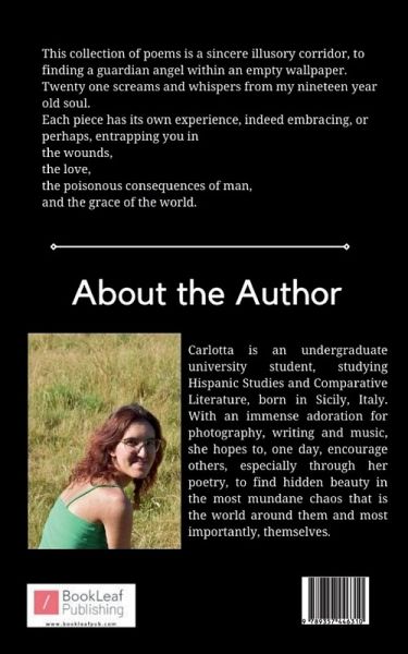 ""This collection of poems is a sincere illusory corridor, to finding a guardian angel within an empty wallpaper. Twenty one screams and whispers from my nineteen year old soul. Each piece has its own experience, indeed embracing, or perhaps, entrapping you in the wounds, the love, the poisonous consequences of man, and the grace of the world.""