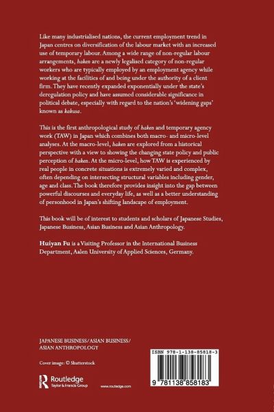 Like many industrialised nations, the current employment trend in Japan centres on the diversification of the labour market with an increased use of temporary labour. Among a wide range of non-regular labour arrangements, haken, or 'dispatched workers' are a newly legalised category of non-regular workers who are typically employed by the employment agency while working at the facilities of and being under the authority of the client firm. In recent years, their numbers have expanded exponentially under the state's deregulation policy and assumed considerable symbolic significance in public debate, especially with regard to the nation's 'widening gaps'. Contrasting sharply with the Japanese post-war salarymen/women model haken generate internal cultural debate where 'traditional' and 'global', or 'positive' and 'negative' values are juxtaposed, contradicted, and negotiated. The debate between and among various interest groups and powerful actors in turn provides important clues to the constantly changing relationship of the individual to the state, to firms, to entrepreneurial opportunities, and to the wider world. Drawing on a range of ethnographic data and documented materials, the book seeks to bring a better understanding of personhood in Japan's shifting landscape of employment. Huiyan Fu's book will be of huge interest to students and scholars of Japanese business, organisational behaviour, employment relations and Japanese anthropology.