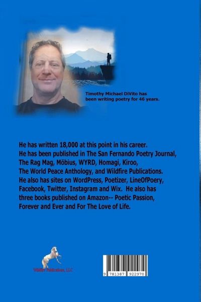 Timothy Michael DiVito has been writing poetry for 46 years. He has written 18,000 at this point in his career. He has been published in The San Fernando Poetry Journal, The Rag Mag, Möbius, WYRD, Homagi, Kiroo, The World Peace Anthology, and Wildfire Publications. He also has sites on WordPress, Poetizer, LineOfPoery, Facebook, Twitter, Instagram and Wix. He also has three books published on Amazon-- Poetic Passion, Forever and Ever and For The Love of Life.