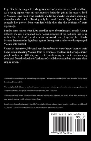 Rhya Sinclair is caught in a dangerous web of power, secrets, and rebellion. As a young orphan with an extraordinary, forbidden gift in the mystical land of Valenko, Rhya must tread carefully amidst the anarchy and chaos spreading throughout the empire. Trusting only her loyal friends, Olga and Adil, she conceals her powers from outsiders while they flee the confines of their orphanage. But fate turns sinister when Rhya stumbles upon a brutal magical assault. Acting selflessly, she aids a wounded man, Robert, unaware of the darkness that lurks within him. As death and destruction surround them, Rhya and her friends become determined to fight back against the oppressive rulers who have plunged Valenko into turmoil. United in their revolt, Rhya and her allies embark on a treacherous journey, their hopes set on liberating Valenko from its tyrannical overlords and saving as many people as they can. Will they succeed in overthrowing the empire and rescuing their land from the clutches of darkness? Or will they succumb to the abyss of an empire at war?