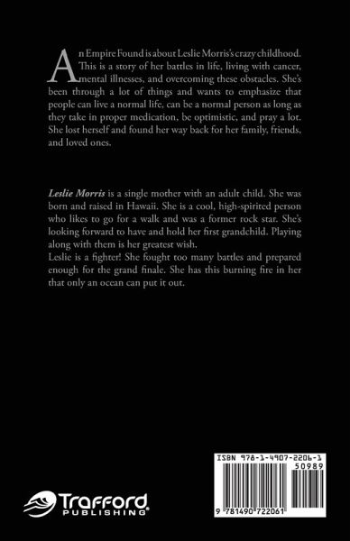 An Empire Found is about Leslie Morris's crazy childhood. This is a story of her battles in life, living with cancer, mental illnesses, and overcoming these obstacles. She's been through a lot of things and wants to emphasize that people can live a normal life, can be a normal person as long as they take in proper medication, be optimistic, and pray a lot. She lost herself and found her way back for her family, friends, and loved ones.