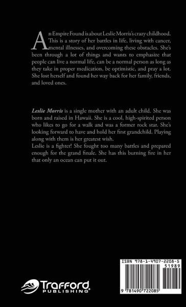 An Empire Found is about Leslie Morris's crazy childhood. This is a story of her battles in life, living with cancer, mental illnesses, and overcoming these obstacles. She's been through a lot of things and wants to emphasize that people can live a normal life, can be a normal person as long as they take in proper medication, be optimistic, and pray a lot. She lost herself and found her way back for her family, friends, and loved ones.