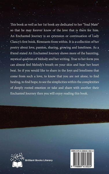 This book as well as her 1st book are dedicated to her "Soul Mate" so that he may forever know of the love that is there for him. An Enchanted Journey is an extension or continuation of Lady Clancy's first book, Remnants from within. It is a collection of her poetry about love, passion, sharing, growing and loneliness. As a friend stated An Enchanted Journey shows more of the haunting, mystical qualities of Melody and her writing. True to her form you can almost feel Melody's breath on your skin and hear her heart beat. So, if you would like to share in the Joys and loneliness that come from such a love, to know that you are not alone, to find healing, to find hope, to see the simplicities within the complexities of deeply rooted emotion or take and share with another their Enchanted Journey then you will enjoy reading this book.