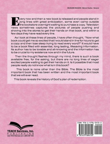 Every now and then a new book is released and people stand in long lines with great anticipation, some even camp outside the bookstore overnight waiting to purchase a copy. Television news sometimes captures the pictures of people pushing and shoving into the stores to get their hands on that book, and within a few days they have read every line. As I look at these lines of people, I have often thought, "Now what book could get me so excited that I would stand in line for hours to get a copy and then lose sleep trying to read every word?" It would have to be a book filled with essential, long lasting, lifesaving information. Its author has to be lovable and all-knowing and the information has to be crucial to my existence now and in the future. Then the thought flashes through my mind, there is such a book available free, for the asking, but there are no long lines of eager excited people waiting to get their hands on it. Is it possible that most people really do not know what is in this book? This book is none other than the Bible. The Bible is the most important book that has been written and the most important book that we will ever read. This book reveals the history of God's plan of redemption.