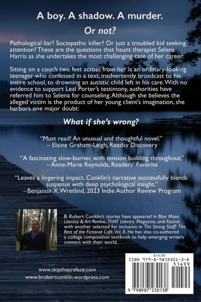 A boy. A shadow. A murder. Or not? Pathological liar? Sociopathic killer? Or just a troubled kid seeking attention? These are the questions that haunt an obsessive-compulsive therapist as she undertakes the most challenging case of her career. Sitting on a couch two feet across from her is an ordinary-looking teenager who confessed in a text, inadvertently broadcast to his entire school, to murdering an autistic child left in his care. With no evidence to support Leal Porter's testimony, authorities have referred him to Selena Harris for counseling. Challenging her professional distance is the emotional bond she develops with this lonely, isolated boy, whom classmates describe as "that scrawny kid who talks to himself at his locker." Although Selena believes the alleged victim is the product of her client's fevered imagination, she harbors one major doubt: What if she's wrong? Selena can relate to Leal's feeling of isolation, especially as she has returned to her small hometown on the heels of a divorce to take care of her father, who has suffered a debilitating stroke. In Leal's case, however, he's a school outcast due to his predisposition to tell tall tales to worm his way out of trouble. Stepping outside the confines of her office in a quest for clues, Selena is willing to violate her ethical oath in her dogged determination to separate fact from fiction. But nothing in her experience prepares her for the harrowing revelation of the inner demon that lurks beneath the surface of Leal's confession.