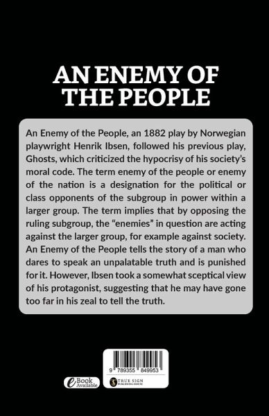 An Enemy of the People, an 1882 play by Norwegian playwright Henrik Ibsen, followed his previous play, Ghosts, which criticized the hypocrisy of his society's moral code. The term enemy of the people or enemy of the nation is a designation for the political or class opponents of the subgroup in power within a larger group. The term implies that by opposing the ruling subgroup, the "enemies" in question are acting against the larger group, for example against society. An Enemy of the People tells the story of a man who dares to speak an unpalatable truth and is punished for it. However, Ibsen took a somewhat sceptical view of his protagonist, suggesting that he may have gone too far in his zeal to tell the truth.