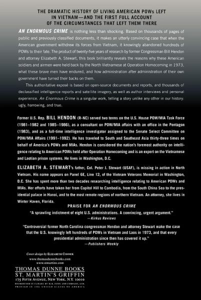 THE NEW YORK TIMES BESTSELLER An Enormous Crime is nothing less than shocking. Based on thousands of pages of public and previously classified documents, it makes an utterly convincing case that when the American government withdrew its forces from Vietnam, it knowingly abandoned hundreds of POWs to their fate. The product of twenty-five years of research by former Congressman Bill Hendon and attorney Elizabeth A. Stewart, this book brilliantly reveals the reasons why these American soldiers and airmen were held back by the North Vietnamese at Operation Homecoming in 1973, what these brave men have endured, and how administration after administration of their own government has turned its back on them. This authoritative exposé is based on open-source documents and reports, and thousands of declassified intelligence reports and satellite imagery, as well as author interviews and personal experience. An Enormous Crime is a singular work, telling a story unlike any other in our history: ugly, harrowing, and true.