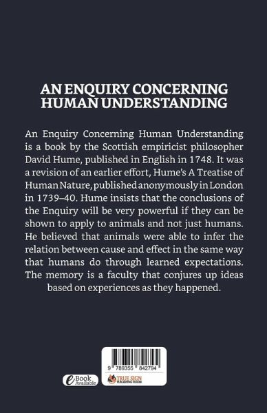 An Enquiry Concerning Human Understanding is a book by the Scottish empiricist philosopher David Hume, published in English in 1748. It was a revision of an earlier effort, Hume's A Treatise of Human Nature, published anonymously in London in 1739-40. Hume insists that the conclusions of the Enquiry will be very powerful if they can be shown to apply to animals and not just humans. He believed that animals were able to infer the relation between cause and effect in the same way that humans do through learned expectations. The memory is a faculty that conjures up ideas based on experiences as they happened.…mehr