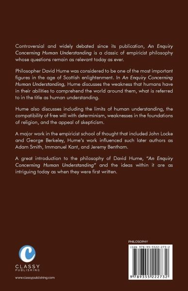 Controversial and widely debated since its publication, An Enquiry Concerning Human Understanding is a classic of empiricist philosophy whose questions remain as relevant today as ever. Philosopher David Hume was considered to be one of the most important figures in the age of Scottish enlightenment. In An Enquiry Concerning Human Understanding, Hume discusses the weakness that humans have in their abilities to comprehend the world around them, what is referred to in the title as human understanding. Hume also discusses including the limits of human understanding, the compatibility of free will with determinism, weaknesses in the foundations of religion, and the appeal of skepticism. A major work in the empiricist school of thought that included John Locke and George Berkeley, Hume's work influenced such later authors as Adam Smith, Immanuel Kant, and Jeremy Bentham. A great introduction to the philosophy of David Hume, "An Enquiry Concerning Human Understanding" and the ideas within it are as intriguing today as when they were first written.