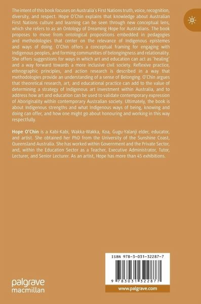 The intent of this book focuses on Australia's First Nations truth, voice, recognition, diversity, and respect. Hope O'Chin explains that knowledge about Australian First Nations culture and learning can be seen through new conceptual lens, which she refers to as an Ontology of Dreaming Hope for Australians. The book proposes to move from ontological propositions embedded in pedagogies and methodologies that center on the relevance of Indigenous epistemes and ways of doing. O'Chin offers a conceptual framing for engaging with Indigenous peoples, and forming communities of belongingness and relationality. She offers suggestions for ways in which art and education can act as 'healing' and a way forward towards a more inclusive civil society. Reflexive practice, ethnographic principles, and action research is described in a way that methodologies provide an understanding of a sense of Belonging. O'Chin argues that theoretical research, art, and educational practice can addto the value of determining a strategy of Indigenous art investment within Australia, and to address how art and education can be used to validate contemporary expression of Aboriginality within contemporary Australian society. Ultimately, the book is about Indigenous strengths and what Indigenous ways of being, knowing and doing can offer, and how one might go about honouring and working in this way respectfully.
