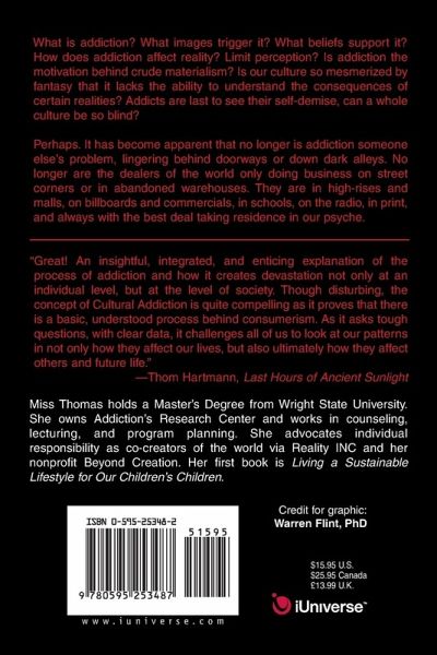 What is addiction? What images trigger it? What beliefs support it? How does addiction manipulate reality? Limit perception? Is addiction the motivation behind crude materialism? Is our culture so mesmerized by fantasy that it lacks the ability to understand the consequences of certain realities? Addicts are last to see their self-demise, can a whole culture be so blind? Perhaps. It has become apparent that no longer is addiction someone else's problem, lingering behind doorways or down dark alleys. No longer are the dealers of the world only doing business on street corners or in abandoned warehouses. They are in high-rises and malls, on billboards and commercials, in schools, on the radio, in print, and always with the best deal taking residence in our psyche. *********** Great! An insightful, integrated, and enticing explanation of the process of addiction and how it creates devastation not only at an individual level, but at the level of society. Though disturbing, the concept of Cultural Addiction is quite compelling as it proves that there is a basic, understood process behind consumerism. As it asks tough questions, with clear data, it challenges all of us to look at our patterns in not only how they affect our lives, but also ultimately how they affect others and future life. --Thom Hartmann, Last Hours of Ancient Sunlight