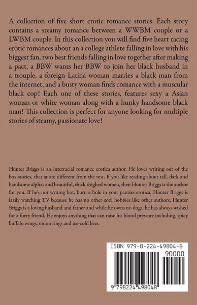 A collection of five short erotic romance stories. Each story contains a steamy romance between a WWBM couple or a LWBM couple. In this collection you will find five heart racing erotic romances about an a college athlete falling in love with his biggest fan, two best friends falling in love together after making a pact, a BBW wants her BBW to join her black husband in a trouple, a foreign Latina woman marries a black man from the internet, and a busty woman finds romance with a muscular black cop! Each one of these stories, features sexy a Asian woman or white woman along with a hunky…mehr
