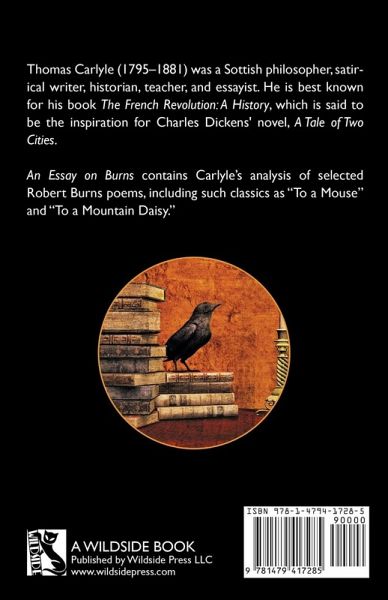 Thomas Carlyle (1795 - 1881) was a Sottish philosopher, satirical writer, historian, teacher and essayist. He is best known for his book "The French Revolution: A History," which is said to be the inspiration for Charles Dickens' novel, "A Tale of Two Cities." "An Essay on Burns" contains Carlyle's analysis of selected Robert Burns poems, including such classics as "To a Mouse" and "To a Mountain Daisy."